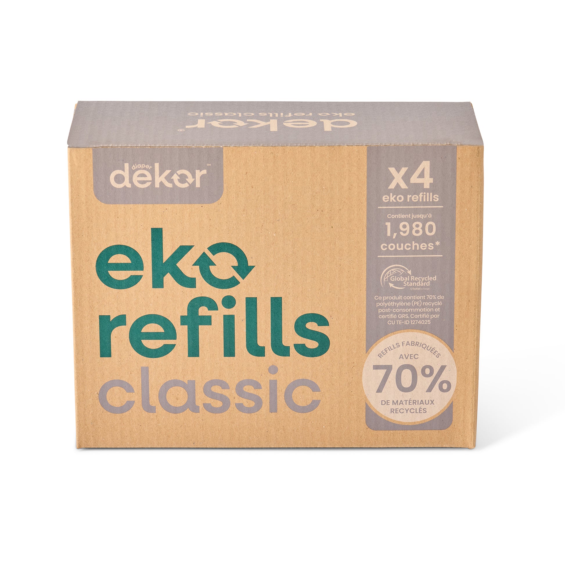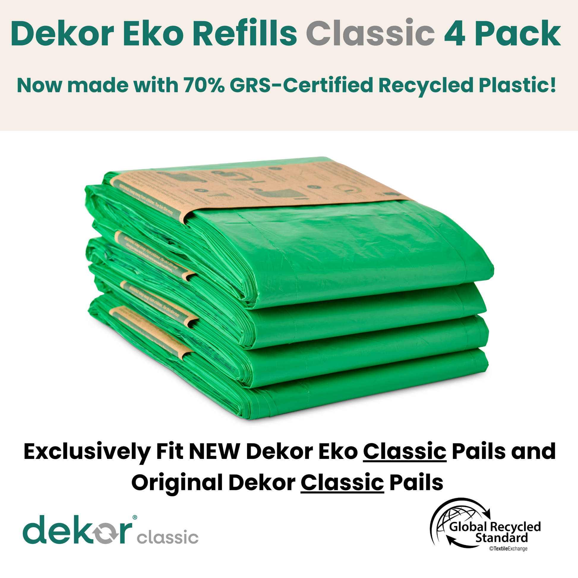 Dekor Eko Refills will make changing your child’s diapers easier and will help reduce your environmental footprint.One of the many benefits of Dekor Diaper Pails is our unique design that makes emptying super simple! While it might seem like regular trash bags are cheaper, Dekor Eko Refills offer a much better value in the long run—they’re easier to use and now made with 70% GRS Certified Post-Consumer Recycled Plastic so they’re better for the environment, and they end up saving you money!